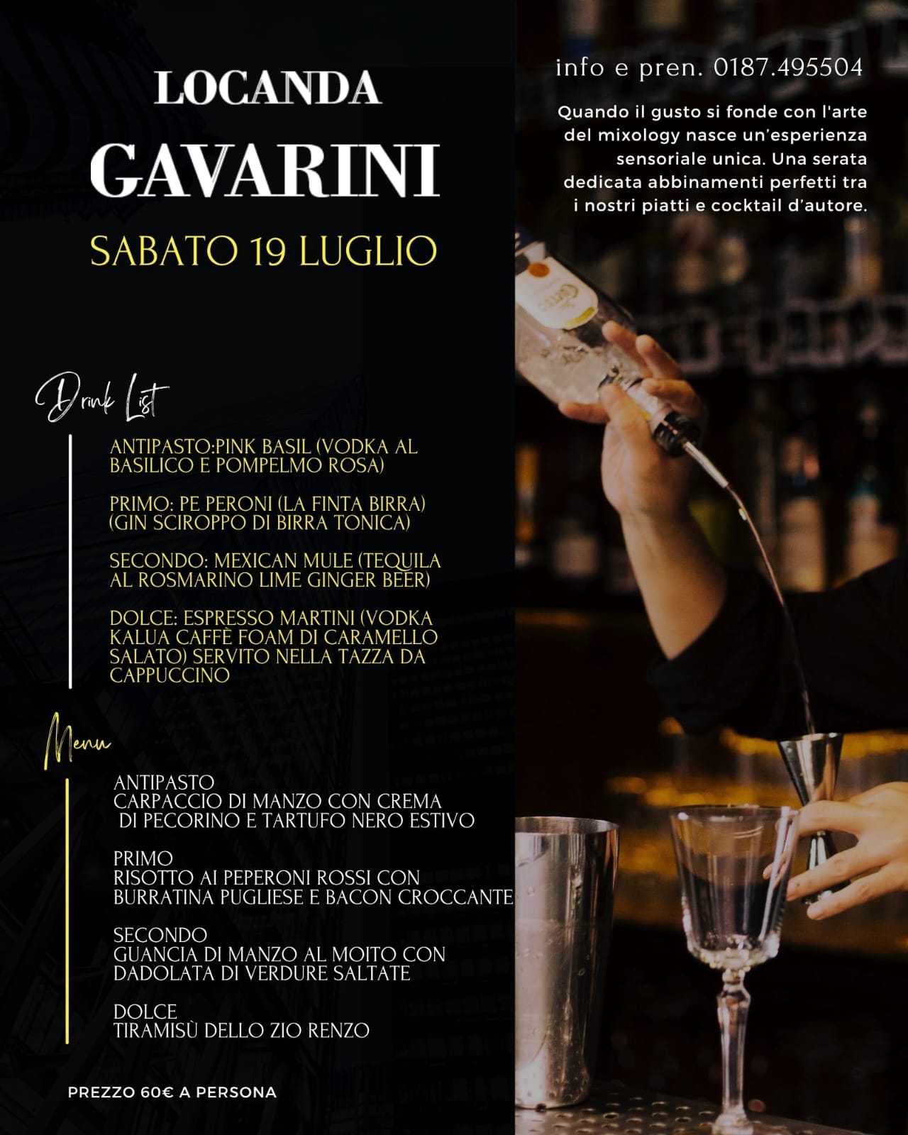 Cibo e mixology: serata indimenticabile! Preparatevi a vivere un’esperienza sensoriale unica Sabato 19 Luglio Quando il gusto si fonde con l’arte del mixology, nascono abbinamenti perfetti tra i nostri piatti e cocktail d’autore Prenota subito il tuo tavolo: 0187.495504Vieni a trovarci… ti aspettiamo con il sorriso, i sapori della tradizione e i nostri cocktail!