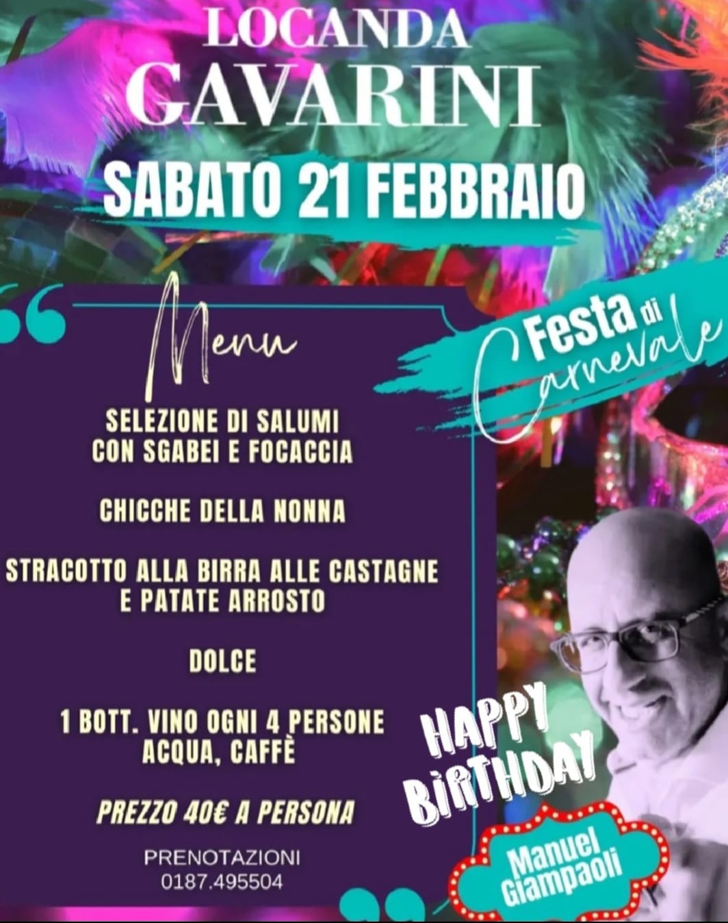 Sabato 1 Marzo preparati a una serata indimenticabile con cena, musica e tanto divertimento! Menù speciale di Carnevale DJ SET Manuel Giampaoli per farvi ballare tutta la notte! Prenota ora!☎ 0187 495504 – 333 8909608 Non perdere l’evento più esclusivo di Carnevale! Maschere, eleganza e tanto divertimento ti aspettano!